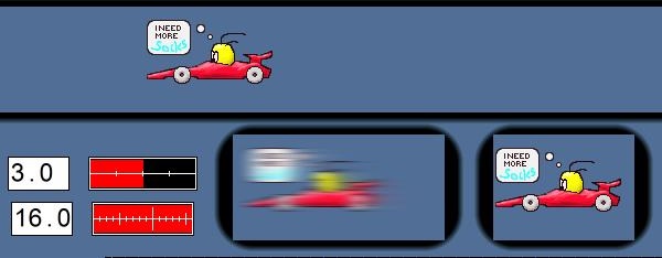 Przy podwojeniu prędkości bolidu, efekt rozmazania jest już wyraźniejszy, ale nie pozostawia za sobą długiego ogona. W zasadzie to rozmazanie jest w stanie wyłapać tylko program analizujący, bo moje oko w dynamicznych scenach filmów czy gier, nie rejestrowało zbytnich zniekształceń obrazu.