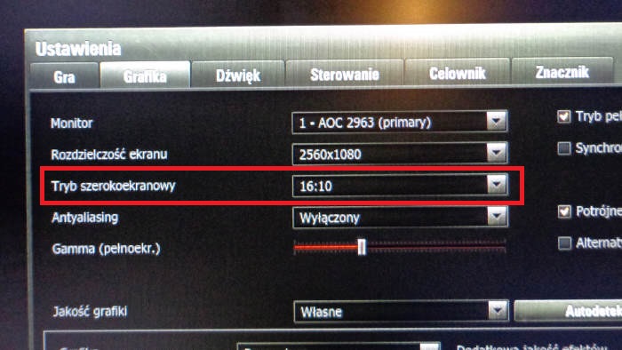 Na AOC Q2963PM trzeba tylko dokładnie zwracać uwagę na ustawienia w menu gry. Często ustawienie samej rozdzielczości natywnej nie wystarczy. Tak było w moim ulubionym tytule World of Tank, w którym po ustawieniu rozdziałki na 2560 x 1080 pikseli, czołgi są jednak trochę "naleśnikowate".