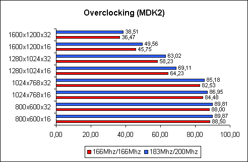 Jak już powiedziałem wcześniej karta taktowana jest zegarem 166/166Mhz tylko dla tego, że jest to wersja OEM, a nie Retail. Nie było żadnego problemu z podkręceniem jej do 183/183Mhz. Dalsze podkręcanie pokazało, że przy taktowaniu rdzenia na 190Mhz zaczynają pojawiać się kropki na ekranie. Wróciłem więc z rdzeniem do pewnego 183Mhz. Pamięci za to dały rewelacyjny rezultal 200Mhz (DDR 400Mhz) bez żadnych problemów. Zrobiłem więc porównanie ustawienia 166/166 i 183/200. Oto wynik: