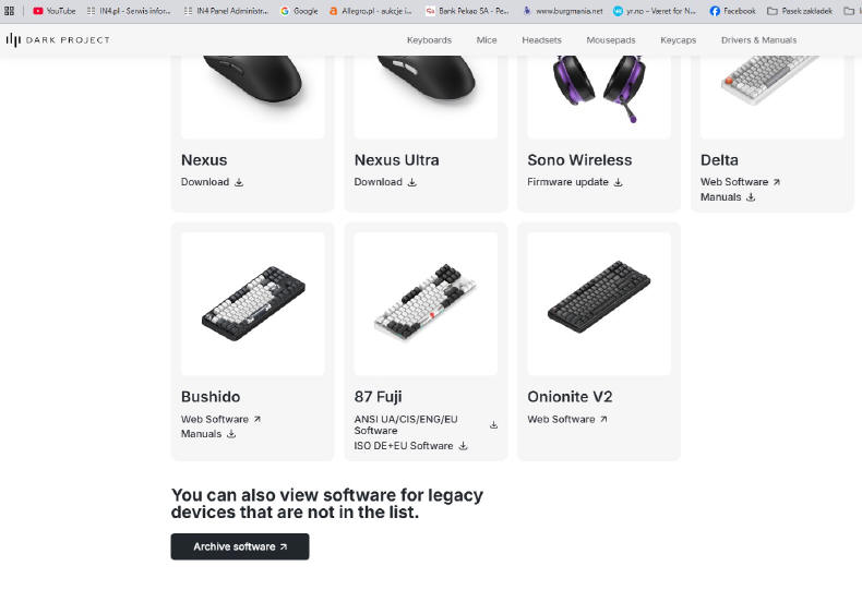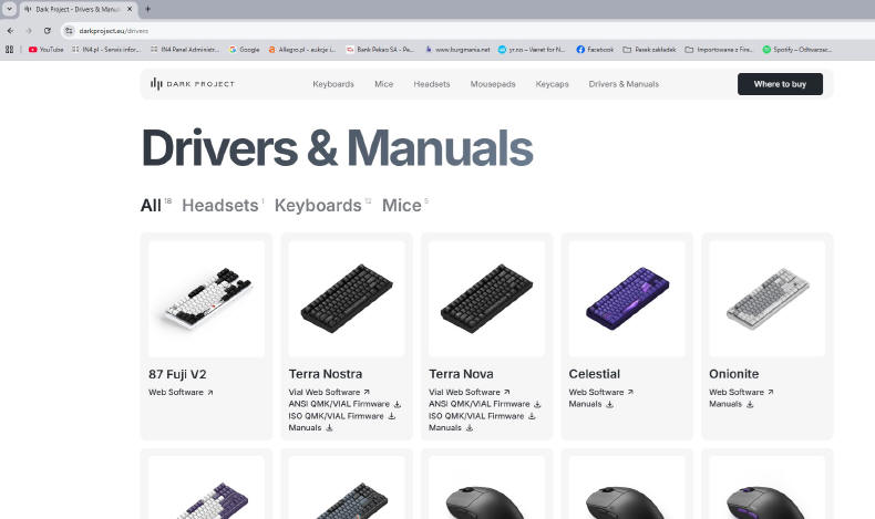 Po podłączeniu do komputera, ONIONITE V2 ożywa paletą barw i choć można skorzystać z opcji dostępnych z klawisza funkcyjnego, warto skorzystać z... oprogramowania On-Line. To genialna sprawa, bo sam jestem minimalistą i wrogiem dedykowanych aplikacji, które zaśmiecają system operacyjny. Tutaj nic nie ściągamy na dysk, a jedynie wchodzimy na stronę Internetową Producenta i wchodzimy w zakładkę Drives & Manuals i wybieramy swój model urządzenia. Po chwili specjalne narzędzie wykrywa podłączoną klawiaturę i prosi nas o zezwolenie na połączenie.