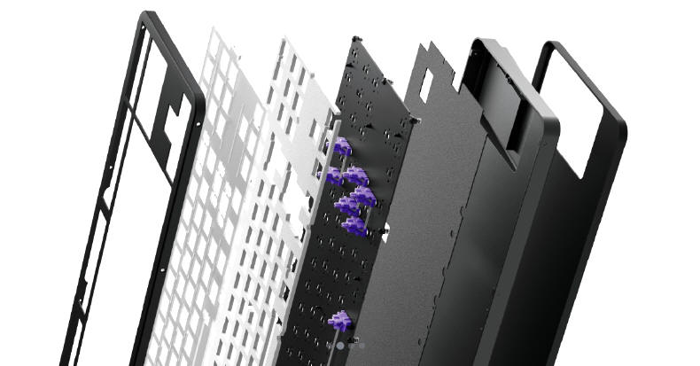 Nim podłączę klawiaturę do komputera i opowiem Wam o wrażeniach z jej użytkowania, wpierw wspomnę o technologiach w niej użytych, bo w założeniu ma być to peryferie o niezwykle komfortowym i przyjemnym dla ucha "kliku". Otóż jej wewnętrzna struktura składa się z kilku warstw ułożonych "kanapkowo" (Gasket Mount). Aluminiowy kadłubek kryje w sobie solidną, ciężką płytę montażową dla gniazd przełączników, okrytą od góry i dołu specjalnymi piankami (PORON), tłumiącymi dźwięk pracy switch’y. Sama główna płyta amortyzowana jest za pomocą wspominanych sprężynek, co podczas pisania pochłaniać ma część energii z dynamicznego rytmu naszych palców. Cała klawiatura waży aż 1260 gramów i to naprawdę czuć w rękach. To zdecydowanie najcięższa "klawa", jaką miałem w rękach, ale dzięki temu jest stabilna na podkładce, jak skała.