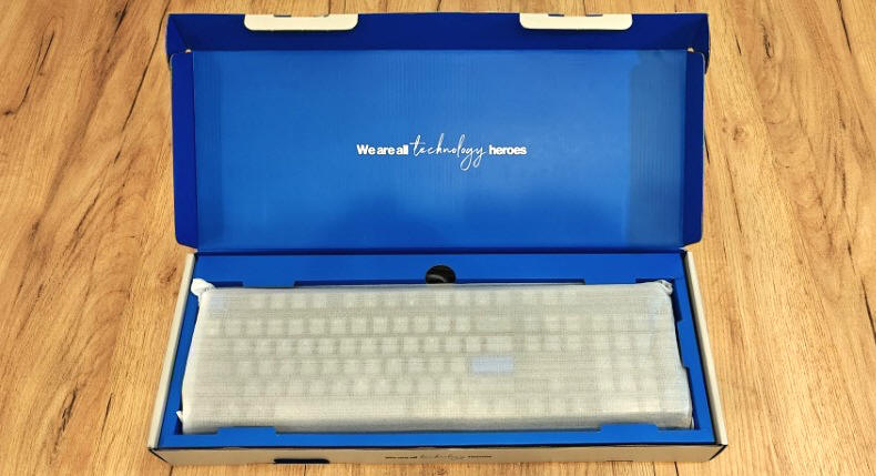 W środku opakowania znajdziemy dobrze zabezpieczony produkt ze sporą liczbą dodatków w postaci kabla USB (długość 1.8 metra), dwóch czapek klawiszy ESC i ENTER w kolorze szarym (domyślnie założone są keycapy niebieskie bez opisów), dwóch zapasowych, żółtych przełączników Gateron, klucz ułatwiający wymianę i instrukcję obsługi. Dodatkowo w zestawie znajduje się jeszcze klucz do zdejmowania cap’ów i nadajnik radiowy 2.4 GHz, ale one są zamocowane na spodzie kadłubka klawiatury.