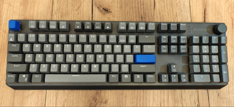 Prawda, że prócz modułu radiowego, wyposażenie jest trochę podobne do produktu Genesis, jednak tam mieliśmy switch’e Gateron Yellow Pro, a tutaj dostajemy ENDORFY Yellow by Gateron, czyli w zasadzie ten sam produkt, ale jednak bez dodatku PRO w nazwie. Czy ma to jakieś znaczenie? Tego dowiecie się w części poświęconej testom, a my przejdźmy teraz do wyglądu samej klawiatury Thock V2 Wireless. Wspominałem wcześniej, że obie konstrukcje (które jestem w stanie na chwilę obecną porównać teraz), na pierwszy rzut oka mogą wydać się dość podobne, ale to chyba głównie dzięki użyciu w nich pokrętła w górnym, prawym narożniku, bo różni je nieco układ klawiszy funkcyjnych.