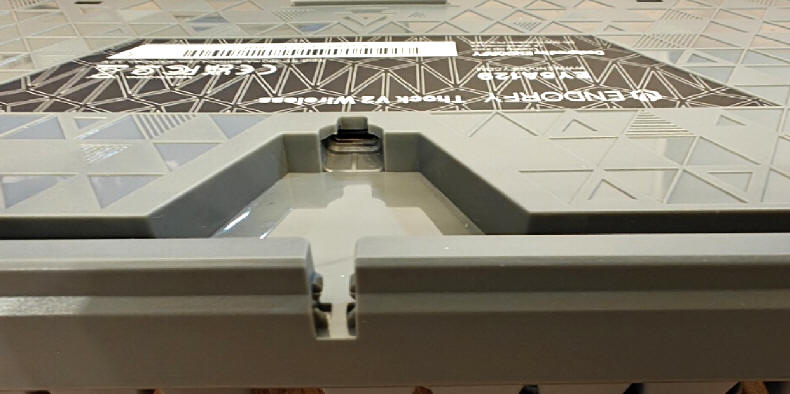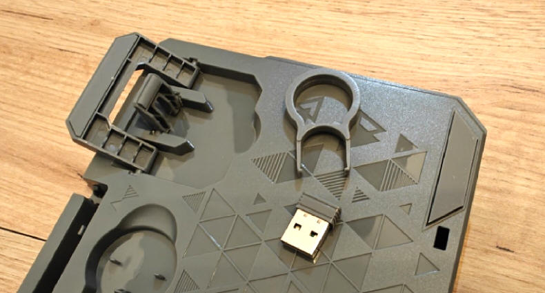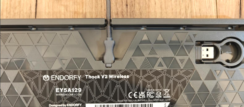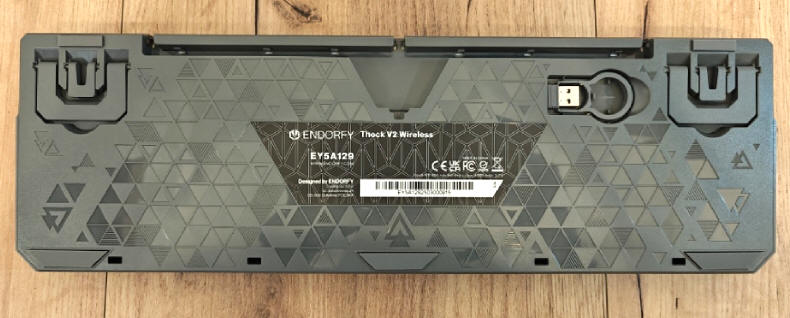 Kiedy odwrócimy kadłubek Thock’a V2, może się nam trochę zakręcić w głowie od ilości odbić światła w kilkudziesięciu trójkątach, ale szybko naszą uwagę zwróci dedykowany schowek na nadajnik radiowy i klucz do demontażu czapek klawiszy. Zwróćcie również uwagę na niezwykle duże, masywne, rozkładane stopki ustawiające większe pochylenie klawiatury. Druga, mniejsza para ukryta jest we wnętrzu tych dużych.