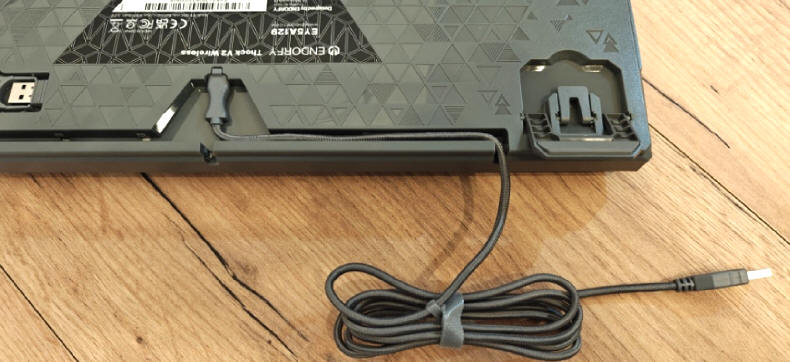 ENDORFY możemy podłączyć do komputera przez szary kabel w tekstylnym oplocie (1.8 m), jednak gniazdo USB-c ukryto dość głęboko w spodzie kadłubka, więc trzeba będzie podnosić klawiaturę, by trafić nim w odpowiednie miejsce. Trochę to nieergonomiczne, ale za to dodano możliwość układania przewodu w kanałach kierunkowych, ustawiających go w pozycjach wyjściowych na lewo, środku i w prawą stronę.