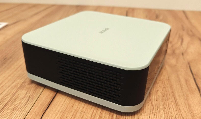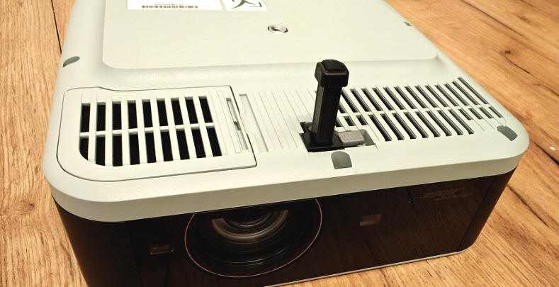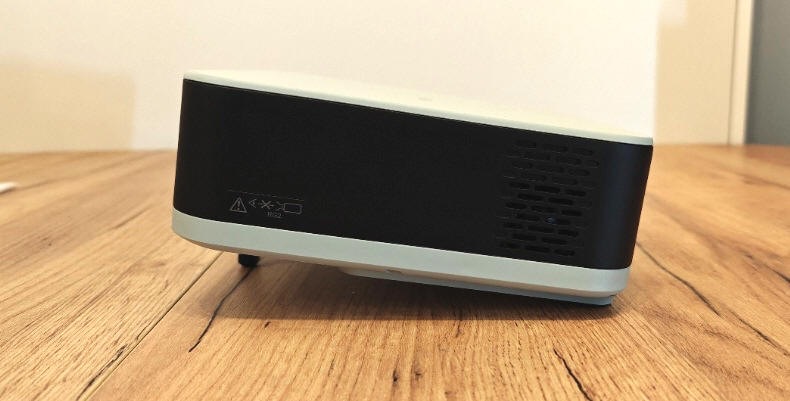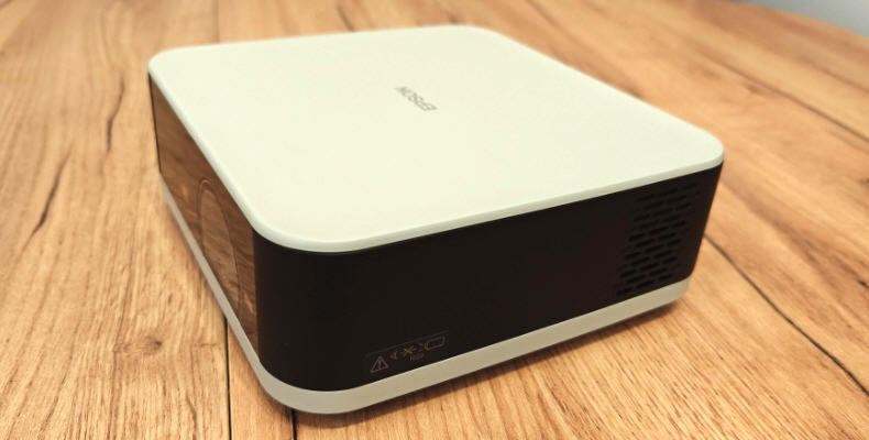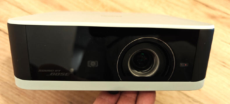 "Kostka przezentuje się naprawdę ładnie, a biel górnej i dolnej pokrywy świetnie kontrastuje z czarną obwolutą boczków. Fa frontowej ścianie znajdziemy obiektyw, sensory IR do pilota i skaner pełniący funkcję wyostrzania obrazu i czujnika "czystego pola" oraz dumnie brzmiący napis Sound by BOSE. Lewa strona (patrząc od frontu), to system wylotowy chłodzenia, w którym umieszczono też jeden z głośników, natomiast po prawej mamy już tylko "siatkę" przykrywającą dalszą część nagłośnienia (2 x 5W).