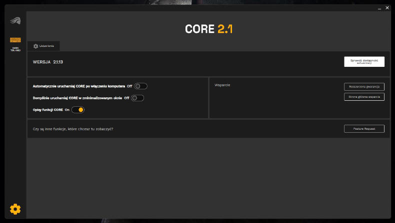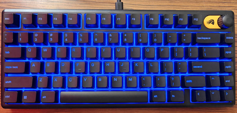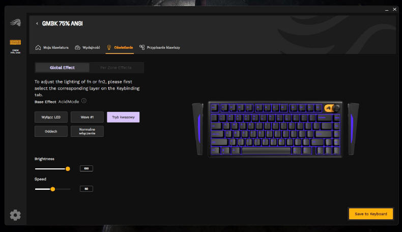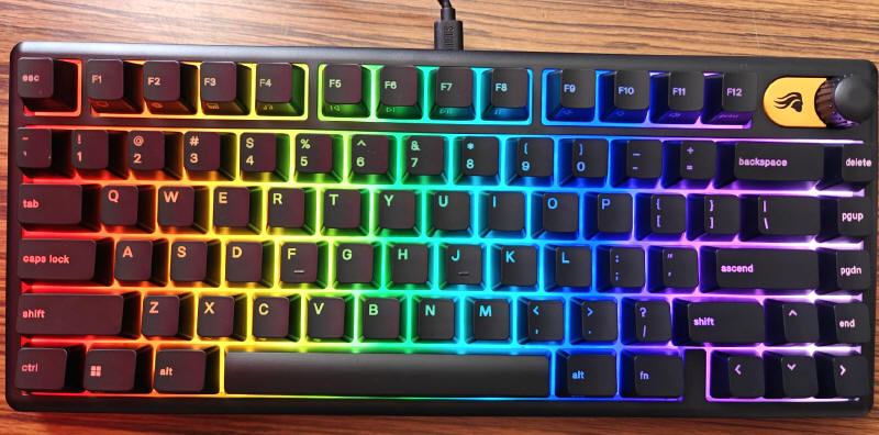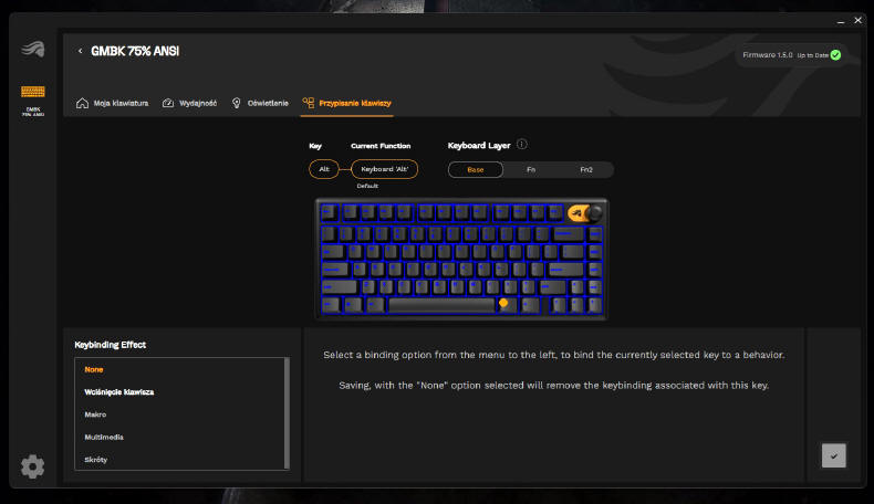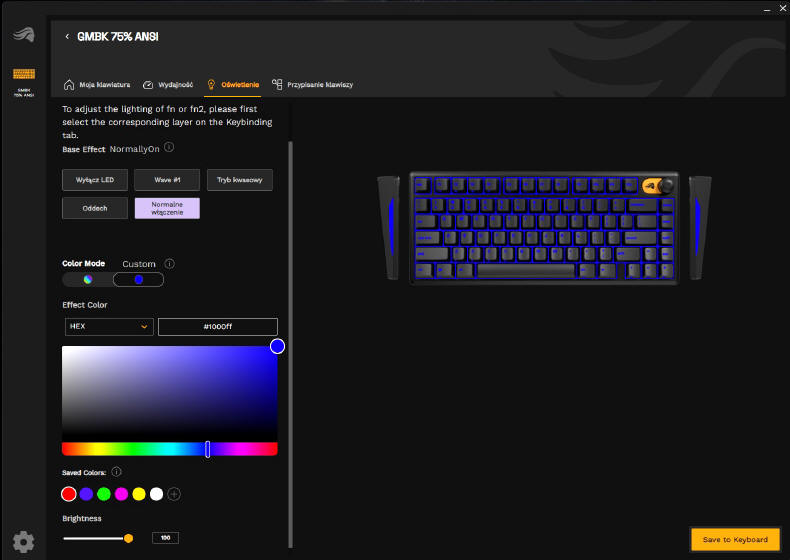 GLORIOUS GMBK 75% jest oczywiście urządzeniem typu Plug&Play, więc wystarczy je tylko podłączyć do komputera i system operacyjny natychmiast przydzieli mu podstawowe sterowniki. Po kilku sekundach możemy już działać na zasobach osiemdziesięciu klawiszy. Standardowo GMBK 75% uruchamia się w opcji podświetlenia zmieniającej się "tęczy" kolorów, ale za pomocą klawisza FN i skrótów przydzielonych do poszczególnych klawiszy, możemy w jakimś stopniu zmieniać iluminację i jego intensywność. Ale nie jest to zbyt wygodne, więc lepiej ściągnąć ze strony producenta aplikację Glorious CORE, która szybko wykryje naszą klawiaturę.
