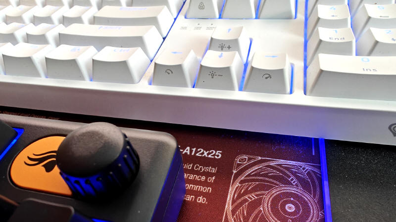 Na zdjęciach intensywność podświetlenia klawiszy, wydaje się zbyt intensywna, ale to tylko efekt naświetlenia w obiektywie aparatu. Naprawdę nie jest one rażące, a nawet jeśli ustawienie 100 procentowe dla kogoś będzie za mocne, może skorzystać z jego pięciostopniowej regulacji. Jak wspominałem, mleczny pasek na boku i ikonki funkcji na bokach poszczególnych klawiszy, są również podświetlone i fajnie widoczne po zmroku, czego nie ma na przykład mój mechaniczny, droższy w zakupie model Genesis THOR 404.
