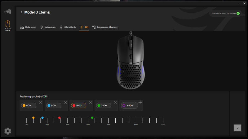 Wspominałem wcześniej, że ustawieniami DPI możemy "żonglować" w ustawieniach. Standardowo mysz odsłania się nam w ustawieniach 400/800/1600/3200 i 6400 DPI. Aby włączyć maksymalną, dostępną wartość, należy nacisnąć "plusik" i wtedy pojawi się nam wartość 12000 DPI. Równie dobrze możemy każde z ustawień dowolnie usunąć i wstawić swoją preferowaną liczbę (ustawienia co 100 DPI), a każde z nich w wybranej kolejności. O przełączeniu się na ustawienie, mysz poinformuje nas wyświetlając na bocznych projektorach RGB, stosownie przydzieloną im barwę (przez moment, później wraca do ustawionej przez nas iluminacji).