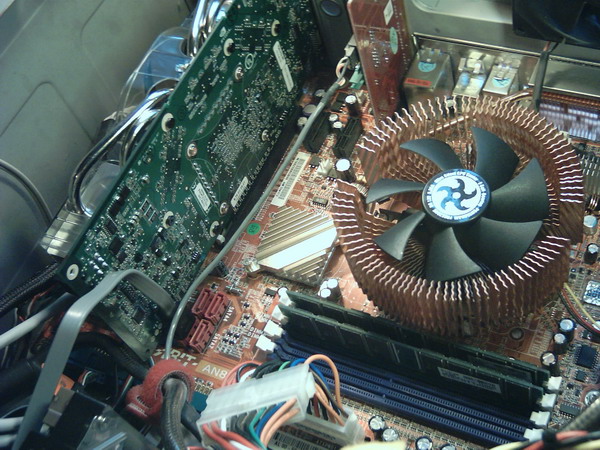 Pierwsza przymiarka do wsadzenia karty w slot PCIexpres zakończyła się niepowodzeniem. Okazało się że na płycie Abit AN8 Ultra karta wadzi o podłączone wtyczki dodatkowego śledzia z gniazdami USB. Musiałem niestety odpiąć ten przydatny gadżet od płyty. Druga karta sieciowa w gnieździe PCI (sieć domowa) również musiała odejść, bo choć wchodziła na styk z coolerem 7800, to niestety skutecznie ograniczała prześwit otworu wentylatora.