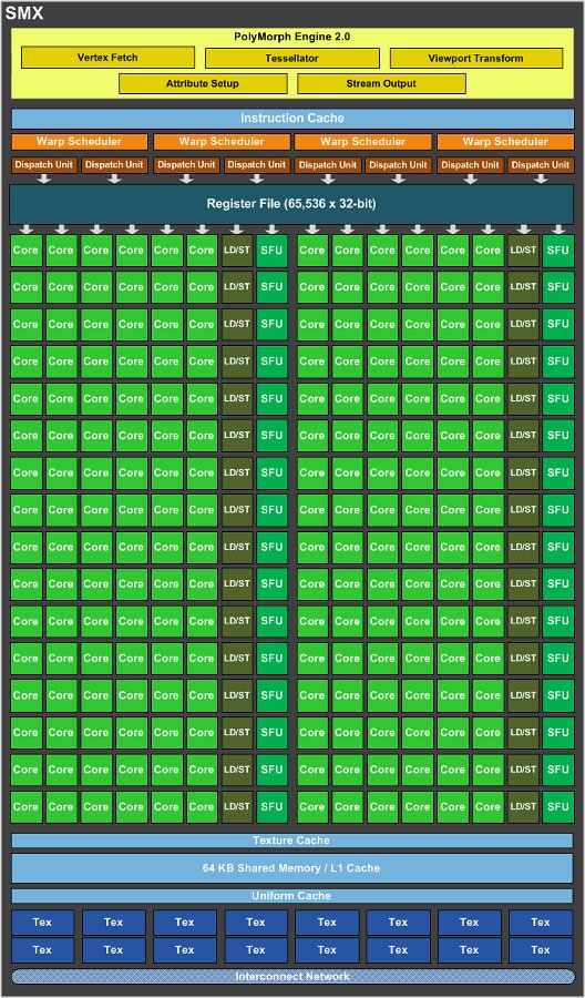 Blok SMX jest sercem całego układu. To tu znajdują się zunifikowane shadery pixel/vertex/geometry, a także tu wykonywane są wszelkie obliczenia GPGPU, obróbka wielokątów, teselacja i teksturowanie.