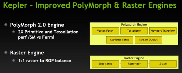 Podobnie jak w układzie GF100/110 mamy cztery klastry przetwarzania grafiki GPC jednak w przeciwieństwie do wspomnianych układów wewnątrz znajdują się dwa bloki SMX, a nie 4 SM. Każdy klaster GPC ma dostęp do własnych jednostek ROP.