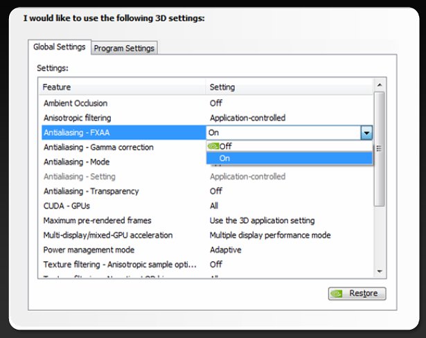 FXAA nie jest techniką nową, a spotkać ją mogliśmy już w takich grach jak BattleField 3, Skyrim czy Duke Nukem Forever. O co więc chodzi? Ano o to, że karty oparte o układ Kepler pozwalają zastosować FXAA do każdej gry z poziomu sterowników. Możemy potraktować to jako odpowiedź na technikę wygładzania MLAA znaną z kart AMD.