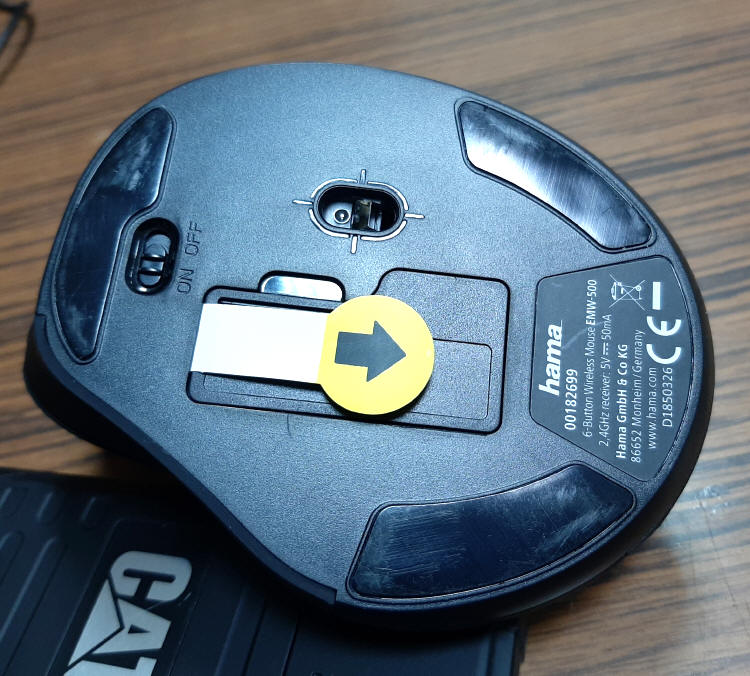Zanim jednak połączymy się z komputerem, należy obrócić mysz do "góry nogami" i wysunąć tasiemkę inicjującą działanie baterii oraz otworzyć spodnią pokrywkę, by z "magazynku" wyciągnąć nadajnik radiowy USB-A 8mm.