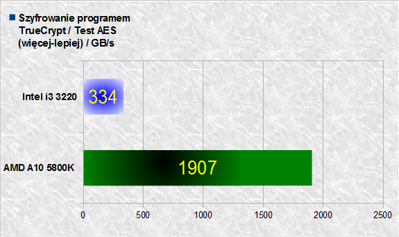 Są również programy, które prócz wykorzystania wielu wątków, kochają architekturę Bulldozer, jak choćby szyfrator TrueCrypt. W wbudowanym benchmarku szyfrowania AES dosłownie miażdży dwa rdzenie Intela.