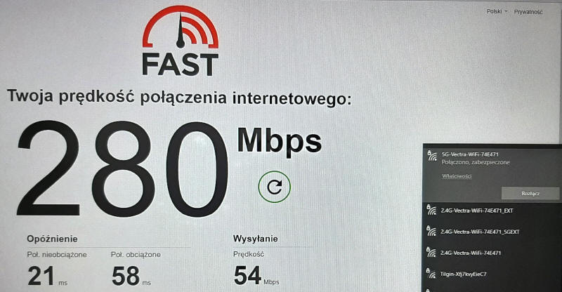 Na ustawieniu połączenia w zakresie 2.4 Ghz, prędkości dla mojej żony były już znacząco gorsze, ale w pełni stabilne i Internet chodził płynnie - na laptopie - 66 Gb/s, ale telefon uzyskiwał już tylko 33 Gb/s. Mimo zmian źródeł, resetu itp, skubany nie chciał łapać więcej... Tragedii nie ma, bo nadal wszystko chodziło stabilnie, ale chciałoby się więcej.