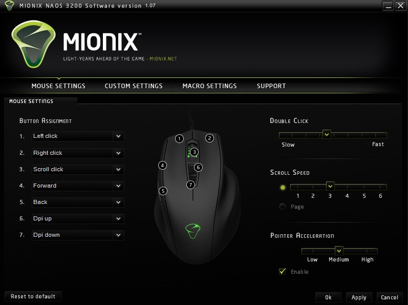 Czas podłączyć mysz MIONIX NAOS 3200 do komputera. Gryzoń jest dość dyskretnie podświetlony, bo wieczorny mrok rozproszy zaledwie stylizowane logo marki na chwycie i wewnętrzna część roki scrolla. Nawet bez instalacji aplikacji sterującej, mysz działa poprawnie w fabrycznych ustawieniach 800/1600/3200 DPI. Każda wartość sygnalizowana jest przez zmianę koloru podświetlenia (czerwone, zielone, niebieskie).