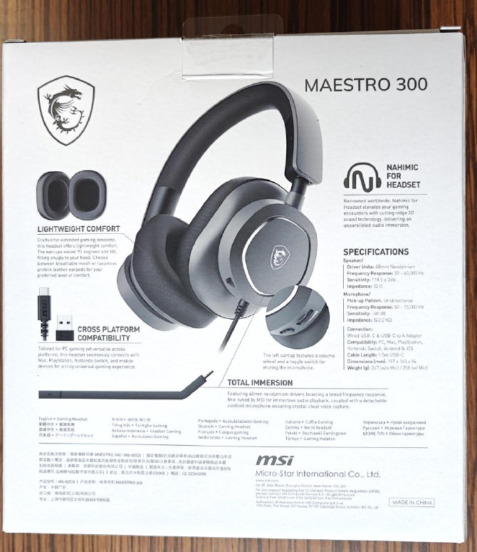 Zanim dokładniej opiszę Wam wygląd i wyposażenie tego zestawu dla graczy, opowiem trochę o jego możliwościach. MSI Maestro 300 to zestaw słuchawkowy wyposażony w 40-milimetrowe neodymowe głośniki o impedancji 32 Ω oraz jednokierunkowy, odłączany mikrofon o dość nowoczesnym i minimalistycznym wyglądzie nauszników, wykonanym w zamkniętej technologii akustyki. Całość waży zaledwie 258 gramów, a więc należy do tej lżejszej kategorii tego typu sprzętów. Zestaw jest kompatybilny z różnymi urządzeniami, od komputerów PC, przez konsole PlayStation, Nintendo Switch, aż po smartfony, więc można go używać wszechstronnie zwłaszcza, że wyposażono go we wtyk USB-C, a komplecie dostajemy stosowną przejściówkę na klasyczne USB-A. Urządzenie działa pod kontrolę aplikacji Nahimic for Headset, choć według producenta, jest to tylko dodatkowa opcja dająca nam większą kontrolę nad dźwiękiem. Nad nią skupię się mocniej podczas testów, bo to naprawdę ważny element tego produktu. W środku, prócz wspomnianego, dopinanego ramienia mikrofonu i przejściówki USB, otrzymamy jeszcze skróconą instrukcję obsługi i drugi komplet poduszek do nauszników, wykończony w ekoskórze. Oba dodatki otrzymały nawet swoje nazwy i tak Mesh Chill, są bardziej przewiewne i mają nam przynieść ulgę w poceniu uszu podczas długich rozgrywek, natomiast Leather Thrill skonstruowano w celu lepszej izolacji dźwiękowej od odgłosów z zewnątrz.