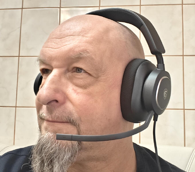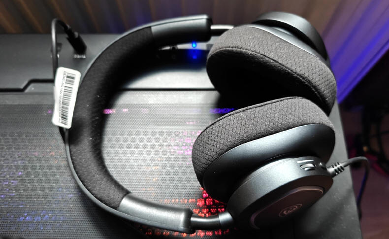 Pierwsze założenie słuchawek MSI MAESTRO 300 (OS38ZC8001000), może wiązać się z uczuciem lekkiego ściskania głowy. Pałąk jest dość sprężysty i dobrze trzyma je na głowie, ale robi to dość mocno. Jednak to pierwsze wrażenie, bo po kilkunastu godzinach ich używania, albo moja głowa przyzwyczaiła się do tej sztywności, albo same słuchawki lekko się ułożyły do niej, bo jakoś nie odczuwałem dyskomfortu przy dłuższych sesjach gry w czołgi czy słuchania muzyki. Jednak zwracam na to uwagę, bo komuś może to mocniej przeszkadzać. Za trzymanie się na głowie, jest wzorowe, nawet przy dynamicznych ruchach. Jedyne, do czego bym się przyczepił, to dość krótki kabel o długości 150 centymetrów. Jeśli macie gniazdo USB w pobliżu swojej osoby, na przykład w klawiaturze, monitorze czy stojącej na biurku obudowie, to wystarcza on zupełnie, jednak jeśli wasz komputer stoi na podłodze, a Wy zajmujecie w fotelu wygodną pozycję, może być odrobinę za bardzo ograniczający uczucie naszej swobody. Mógłby być przynajmniej o dziesięć centymetrów dłuższy.