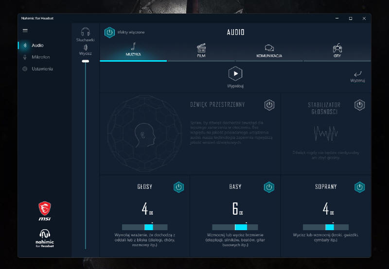 Program Nahimic for Headset daje nam już takie narzędzia, jak sterowanie zakresami basów, sopranu czy podbicia zakresu dla dialogów, a wszystko to dla osobnych, predefiniowanych działów, jak Muzyka, Film, Komunikacja i wreszcie Gier. Dodatkowo możemy sobie włączać generowanie dźwięku przestrzennego, z czego w dziale Muzyka jest on domyślnie wyłączony i lepiej z niego nie korzystać, bo wtedy przy wejściowym sygnale stereo, potrafią się pojawiać jakieś dziwnie pływające (falujące), zniekształcenia.