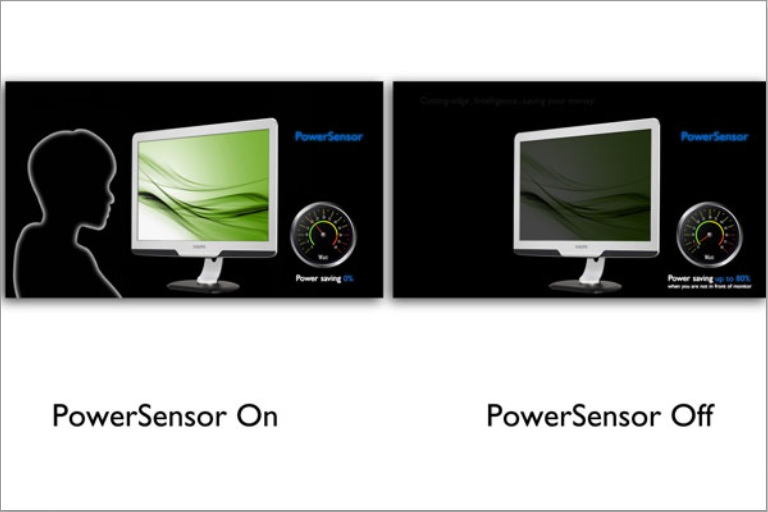 Już wiemy jak wygląda Philips Brilliance 235PQ2, teraz zobaczmy to, czego oczy bez podłączenia do prądu nie są w stanie zobaczyć. Model ten w zamyśle ma nam dać niezłej jakości obraz w połączeniu z dbałością o zasoby naszego portfela przez pro-ekologiczne systemy oszczędzania energii, dlatego też otrzymujemy właśnie technologię PowerSensor. Nasz monitor będzie zatem bacznie obserwował naszą obecność przed swoimi ramkami i wiązką fal sprawdzał czy jesteśmy przed nim w danym momencie. Jeśli odejdziemy od komputera, automatyka ustawi niższy poziom podświetlenia matrycy (w tym przypadku technologia LED w układzie W), co przyniesie zauważalny spadek poboru mocy pracującego urządzenia. Model ten nawet w normalnym trybie pracy nie zużywa wiele prądu, bo potrzebuje maksymalnie niecałe 28W mocy, jednak dzięki współpracy z sensorem, jest w stanie "zjechać" do kilku Watów. Kiedy włączymy dodatkowo funkcję ECO Mode, nawet w trybie normalnej pracy osiągnie pobór mocy na poziomie 18.3W.