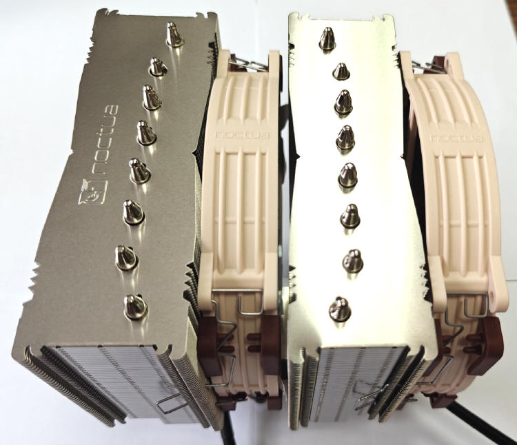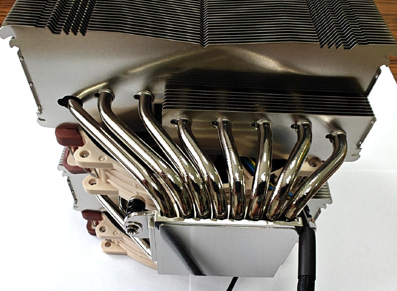 Drugą poważną zmianą w modelu Noctua NH-D15 G2 względem starego NH-D15, jest radiator. To również konstrukcja dwuwieżowa oparta na ciepłowodach Heatpipe, jednak ich liczba wzrosła z sześciu do ośmiu rur gazowych (szesnaście końcówek transportujących ciepło). Prócz tego ciepłowody znacząco odchylono w jedna stronę, by jak najbardziej oddalić radiator od karty graficznej. To zabieg wymuszony przez konstrukcje najnowszych płyt głównych, na których koszyki utrzymujące procesory stały się znacznie większe i zbliżyły się w stronę portu PCIexpres x16, ale i same karty graficzne stały się potężne oraz znacznie bardziej gorące, niż kiedyś.