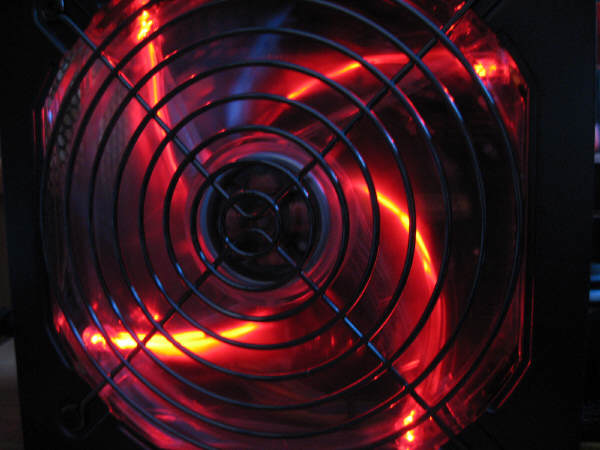 Jak na pewno zwróciliście uwagę, zasilacz wyposażono w wentylator (140 mm), wykonany z przejrzystego plastiku. Jego zadaniem, prócz chłodzenia jest walor estetyczny, osiągany przez czerwone diody LED, które nadają mu "krwistego" wyglądu.