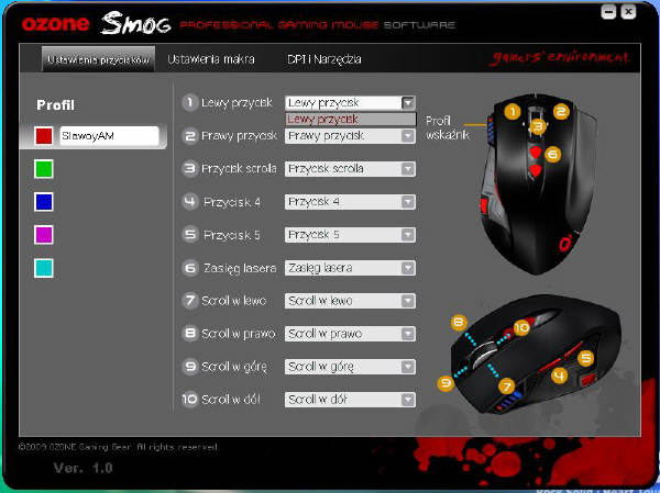 Cały program jest bardzo intuicyjny. Pierwsza zakładka pozwala przydzielić ustawienia poszczególnych przycisków, do poszczególnych pięciu profili, oznaczonych kolorami.