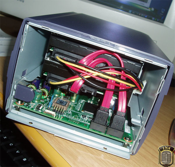 Wewnątrz dwa dyski SATA połączone w RAID (0 lob 1). Niestety nie miałem możliwości aby dalej rozkręcać urządzenie... A przyznam, że korciło mnie aby dokładnie sfotografować wnętrze. No ale niestety...