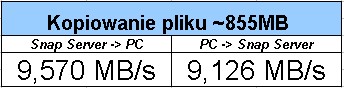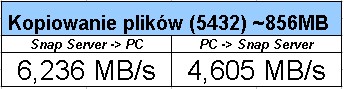 Wydajność Snap Serwera sprawdzałem w standardowej sieci 100Mbit. NAS wpięty został do niej poprzez router. Pamiętać należy, że test ten nie pokazuje maksymalnej wydajności , a jedynie ma na celu wykazać w jaki sposób urządzenie zachowuje się w standardowych warunkach pracy. Test został podzielony na dwie części. W pierwszej kopiowany był jeden plik o wadze ~855 MB, w drugiej natomiast, te same dane podzielone zostały za pomocą programu WinRar na 5432 części (~856MB). Dane powielane były w dwóch kierunkach NAS->PC oraz PC->NAS. Z wynikami można zapoznać się poniżej.