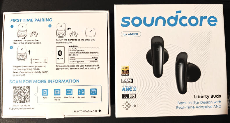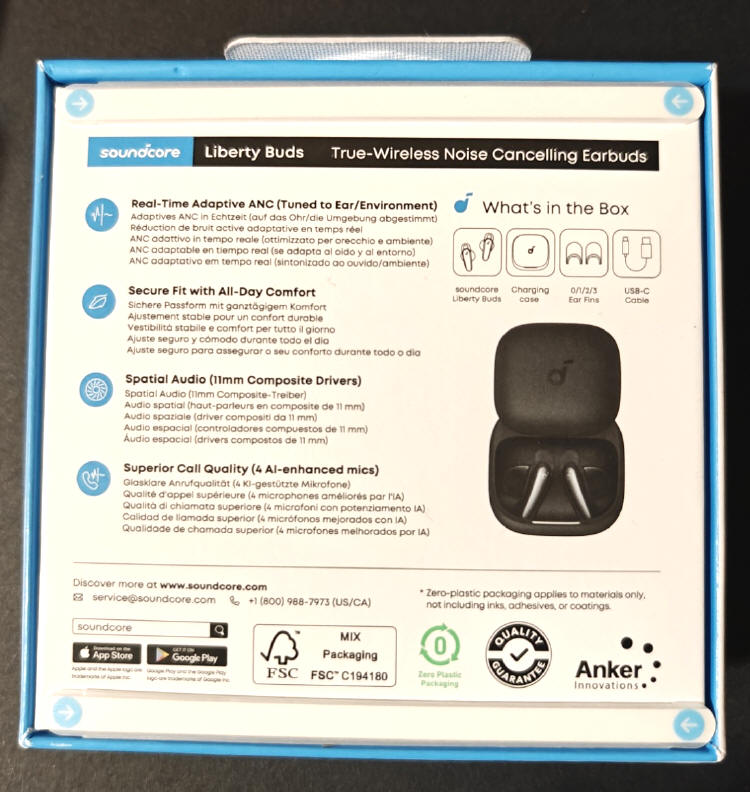 Natomiast Liberty Buds, to produkt zapewniający nam wysoką jakość dźwięku audio, co potwierdza klasa Hi-Res Audio oraz wsparcie LDAC, ale tutaj również nie zabrakło systemu redukcji poziomu hałasu w czasie rzeczywistym (Adaptive ANC 3.0). Dodatkowymi atutami ma być ich wysoka wytrzymałość na warunki pracy (odporność IP55 na kurz i zachlapania) oraz rozbudowany system mikrofonów 4-Mic Clear Calls sterowanych przez sztuczną inteligencję AI i współpraca z funkcją Smart Translation (wbudowaną w aplikację Soundcore), pozwalającą na komunikację/tłumaczenie w ponad 100 językach! No przyznacie, że brzmi ciekawie... Ale zanim Wam to wszystko opowiem, zobaczmy, jak prezentuje się opakowanie tych słuchawek i co znajdziemy w środku.