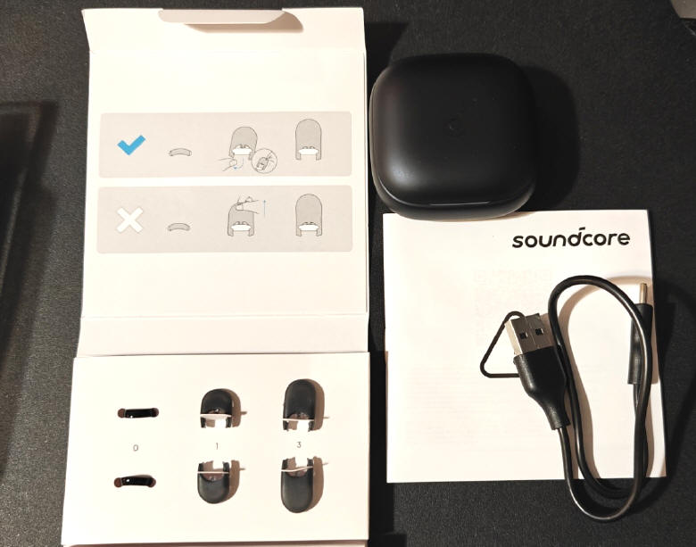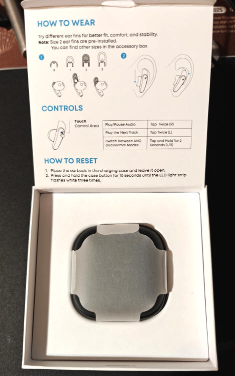 W środku przywita nas samouczek pokazujący, jak wydobyć słuchawki z etui, a pod nim znajdziemy elegancko zapakowane opakowanie stanowiące jednocześnie powerbank, kabelek USB pomocny przy podłączeniu do źródła zasilania oraz kartonik z "uszkami" o różnych rozmiarach, które możemy wymieniać w kadłubku lewej i prawej słuchawki, dostosowując jej długość do wymiaru wewnętrznej części małżowiny naszego ucha. Gdybyśmy nie chcieli z nich korzystać, możemy szparkę przeznaczoną do ich montażu zamknąć dedykowanymi półpierścieniami, co pozwoli uzyskać jednolitą powierzchnię kadłubków.