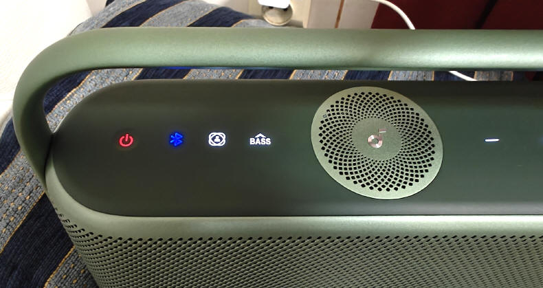 Naciskam przycisk Power i... Tu pierwsze zaskoczenie, bo głośnik powitał mnie głębokim, doniosłym, basowym sygnałem, po którym pojawił się sygnał "sonaru", poszukujący połączenie ze źródłem dźwięku. Zadrżała i delikatnie przemieściła się łyżeczka położona na kubku z kawą, a ja fizycznie na ciele odczułem ten dźwięk. Normalnie ciary! Wszystkie przyciski funkcyjne są podświetlone, a zmiana koloru ikonki BT na niebieską, oznacza połączenie ze źródłem sygnału. U mnie po "dziewiczym" rozpakowaniu z folii i pierwszym uruchomieniu, włączone domyślnie były funkcje dźwięku przestrzennego i wzmocnienia Basu, więc proszę, zwróćcie na to uwagę, jeśli pierwszy raz będziecie słuchać modelu X600, bo bez tych systemów Wasze odczucie będzie zapewne nieco inne, ale o tym napiszę nieco dalej.
