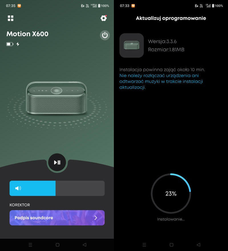 Warto ściągnąć na telefon dedykowaną Appkę od marki SOUNDCORE, bo dzięki niej zyskamy sporo dodatkowych możliwości ustawień audio i szybkiego sprawdzenia stanu naładowania baterii. Co ważne przy pierwszym jej uruchomieniu, aplikacja natychmiast wykryła nową wersję oprogramowania systemowego Firmware i zaproponowała aktualizację.