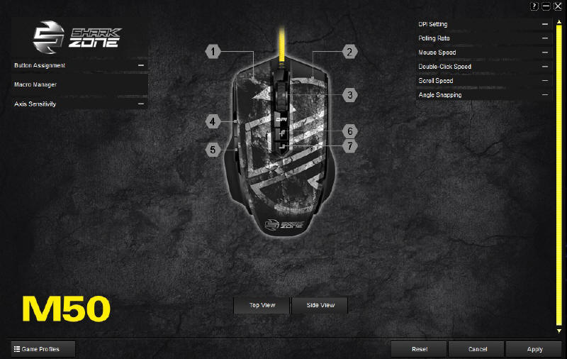 Po drugiej stronie Menu aplikacji sterującej mamy jeszcze więcej ustawień. Pierwsza z nich przydziela gotowe ustawienie wartości DPI dla grzbietowych przycisków + i -. Możemy ich zaprogramować aż sześć jednocześnie. Gdy w jakiejś grze jedna z nich nam nie będzie pasować, nie trzeba jej zmieniać, a wystarczy ją tylko wyłączyć żółtą kropką pod odpowiednim słupkiem. Od tego czasu możemy płynnie przechodzić między kolejnymi ustawieniami bez konieczności przeskakiwania niewygodnego DPI. O każdej zmianie wartości, program poinformuje nas wyświetleniem komunikatu w dolnym, prawym rogu ekranu.