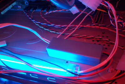 Inwerter (który również znalazł się w paczce) spełnia funkcję zasilającą dla tzw. świecących zimnych katod. Aby katoda świeciła należy podłączyć ją do takiego inwertera, który wcześniej podłącza się do zasilacza. Dostarczony inwerter posiadał wejście na dwie katody, dlatego niemożliwe było podłączenie wszystkich dostarczonych katod jednocześnie. Aby "rureczki" zaczęły świecić należy wcześniej połączyć ze sobą dwa kabelki wychodzące z inwertera (miejsce na wyłącznik, którego omyłkowo zabrakło w paczce, a który standardowo sprzedawany jest wraz z inwerterem).