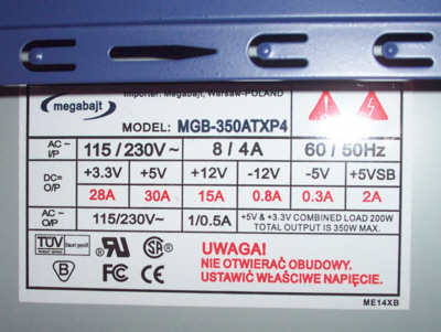 Co się tyczy zasilaczy to dostarczony Megabajt MGB-350ATXP4, dostarczony w paczce wraz z obudową (należy tu dodać, że obudowa nie jest sprzedawana wraz z zasilaczem), w zupełności wystarczy wszystkim tym którzy nie podkręcają swoich maszyn do granic wytrzymałości, ale nie wystarczy overclockerom i tym którzy tuningują swoje pecety. Lecz należy pamiętać, że stabilność komputera w dużej mierze (zwłaszcza po mocnym podkręceniu jego podzespołów) opiera się na działaniu zasilacza. Dlatego nie należy lekceważyć tego elementu przy wyborze zestawu komputerowego zwłaszcza przez kogoś, kto planuje bawić się w ekstremalne podkręcanie maszyny. W przypadku, gdy chcemy by nasz komputer świecił i posiadał w sobie wszystkie z opisywanych w tej recenzji dodatków, tym bardziej nie powinniśmy oszczędzać na doborze tego podzespołu.