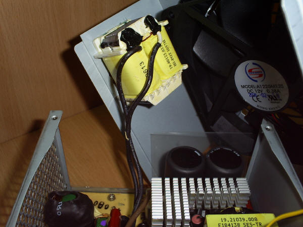 Odkręcam cztery wkręty i usiłuję zdjąć pokrywę obudowy zasilacza. Idzie dość opornie. Winowajcą okazują się grube przewody biegnące do transformatora umieszczonego na boku pokrywy.