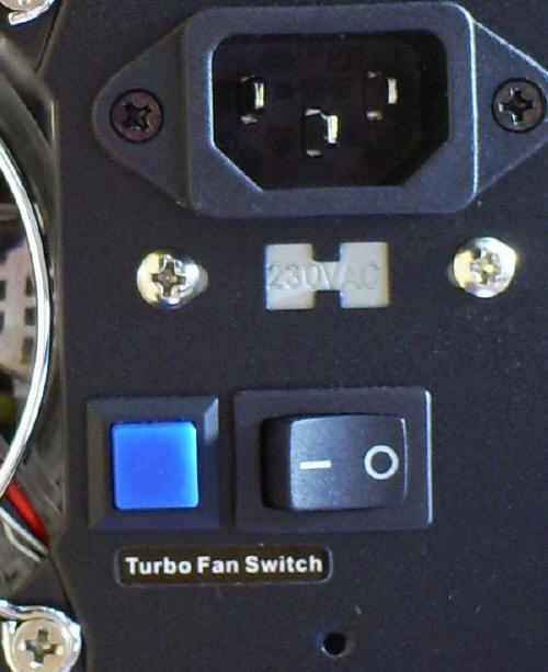 Z frontowej strony Spire SP-ATX-Z500W-EU panuje wentylator wykonany z przezroczystej masy pleksiglasowej, podświetlanej diodami LED na kolor niebieski. Obok gniada zasilania i włącznika I/0 znajdziemy też tajemniczy, niebieski przycisk opisany jako : Turbo Fan Switch. Jak łatwo się domyślić, jest to ręczny włącznik trybu przyśpieszającego obroty wentylatora do poziomu maksymalnych obrotów. Ciekawe rozwiązanie, ale nieco więcej napiszę o nim podczas samych testów.