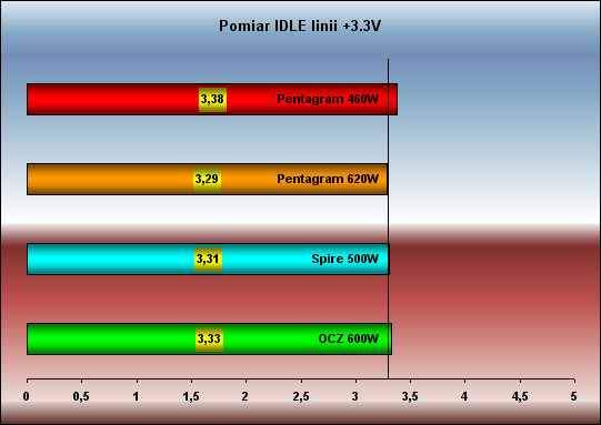 Pierwszy pomiar IDLE był wzorowy dla wszystkich linii. OCZ ma tendencje do zawyżania napięcia 12V (podobnie jak produkty Tagana i SilverStone), i tak odnotowałem 3.33V, 5.05V i 12.31V.