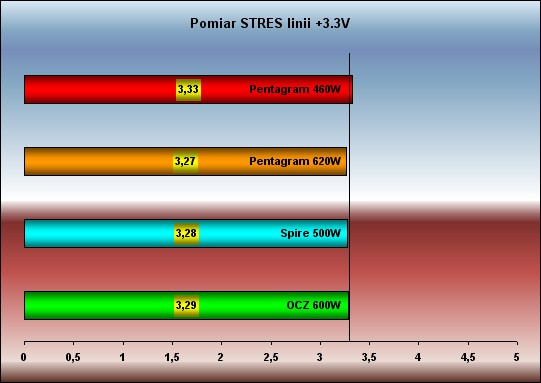 Jednak obciążenie komputera aplikacjami testowymi powoduje u Spire największy spadek napięcia linii +12V. Najniższe wskazanie wynosiło 11.86V co daje różnicę wynoszącą 0.25V. Pozostałe linie nie odczuły już tak mocno wytężonej pracy jednostki (3.28V / 4.97V)